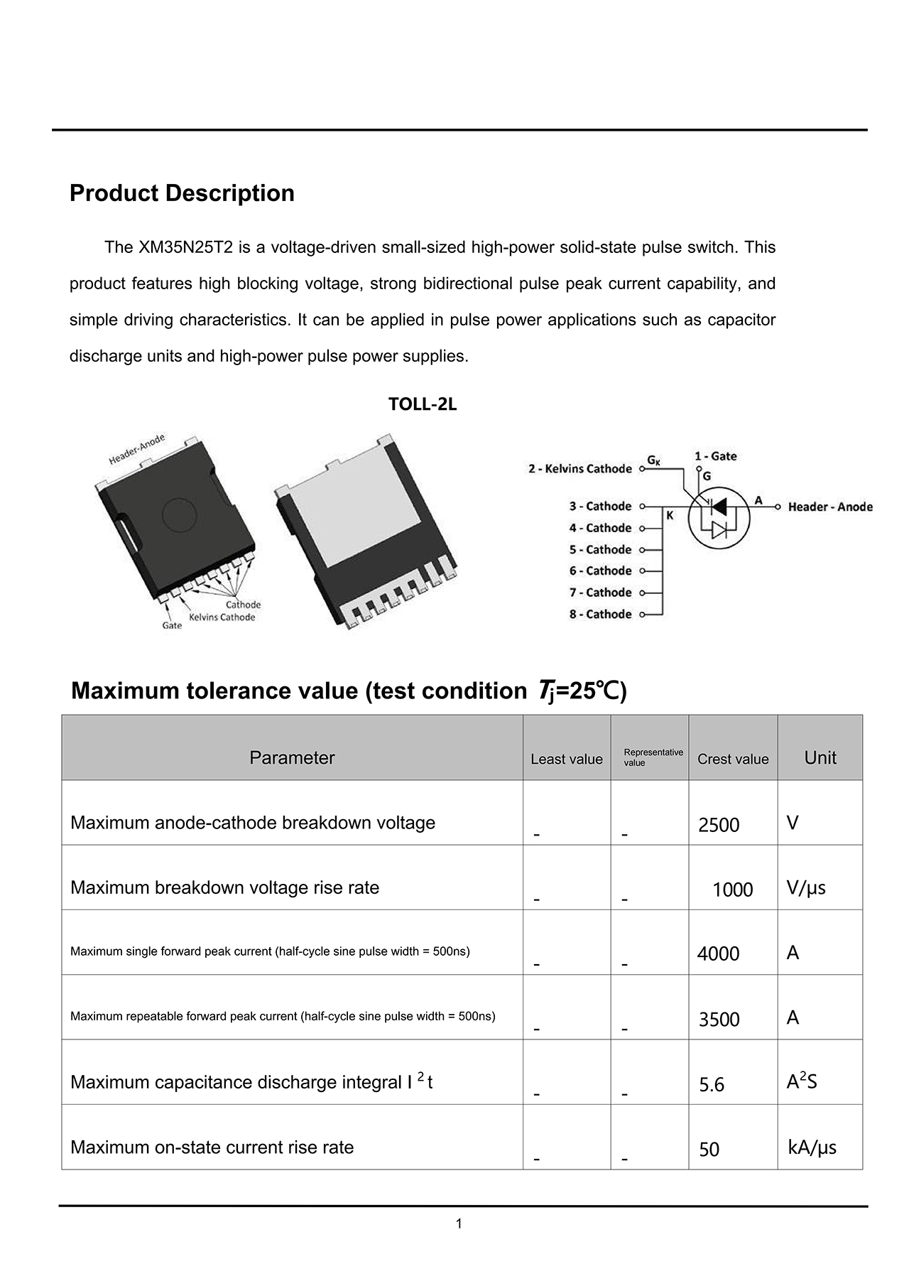 Product Description XM35N25T2 is a compact, voltage-driven high-power solid-state pulse switch. It offers high blocking voltage, strong bidirectional peak pulse current capability, and simple drive requirements. Ideal for pulse power applications such as capacitor discharge systems and high-power pulse power supplies.
